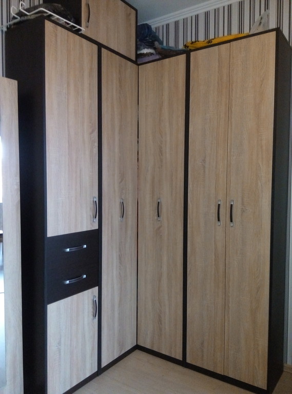 Шкаф дешевого сегмента. Ожидать от него качества не стоит. Покупали по акции, т.к. Срочно нужна была прихожая. Собрали, установили, все элементы между собой стянули мебельными стяжками.