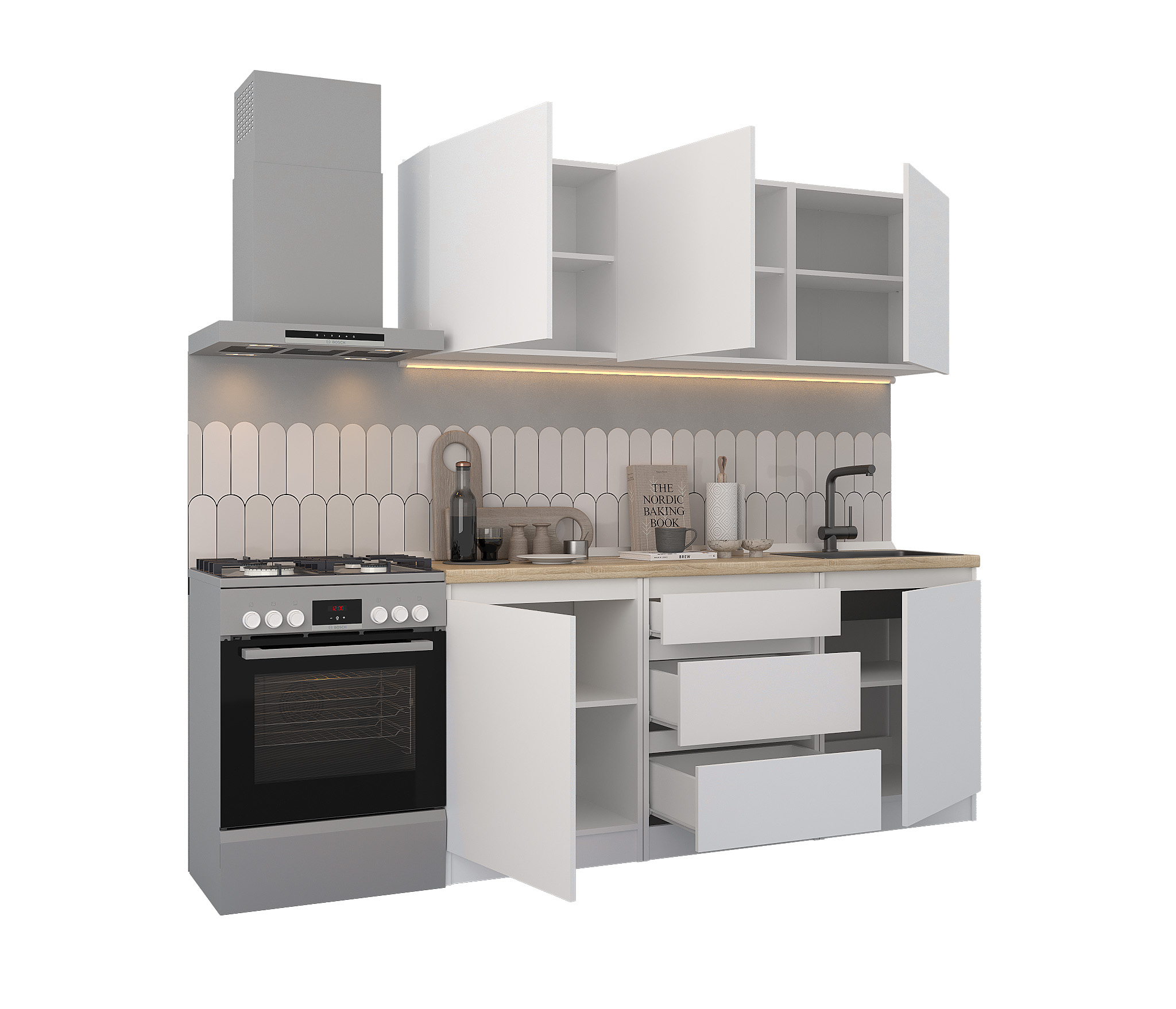 Обратите внимание, что столешница, стеновая панель, мойка и смеситель не входят в комплектацию кухни Леон и приобретаются отдельно. Это позволяет вам выбрать идеальные аксессуары и элементы для создания индивидуального дизайна вашей кухни.